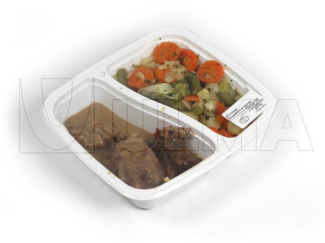 Gekochter Rindereintopf und Gemüse in Schalenversiegelung mit modifizierter Atmosphäre (MAP)