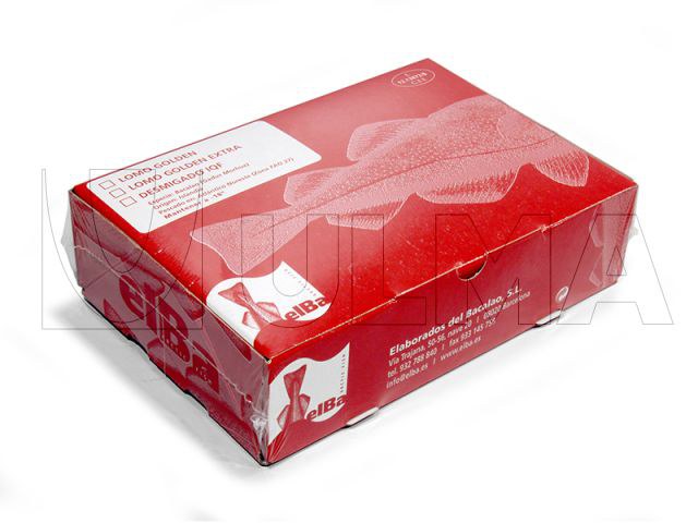 Kabeljau-Portionen in Schachtel mit Seitenversiegelung und Schrumpffolie verpackt