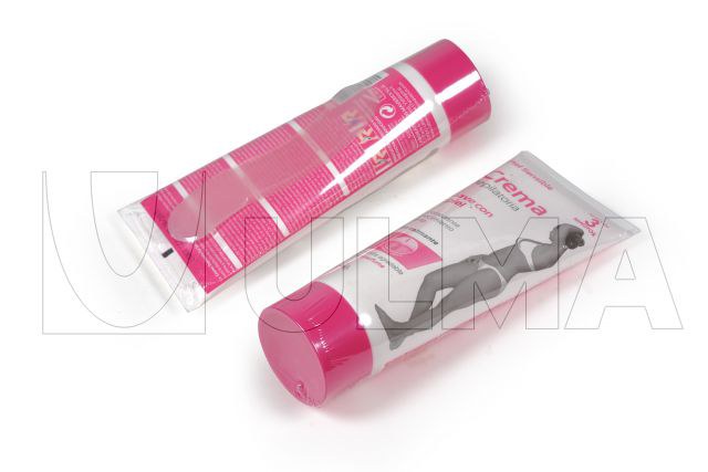 Verpackung und Schrumpfung von Enthaarungscremetuben mit Plastikspachtel in Polyethylenfolie. Verpackung, welche den Schutz des Tubendeckels und Spachtel garantiert und eine ausgezeichnete Präsentation bietet. 1547_1.jpg SC 500 Automatische Seitenversiegelungsmaschine für Schrumpffolie und andere Folienarten. Für hohe Packleistungen geeignet.
