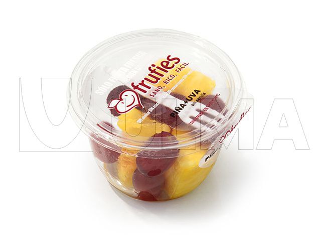 Verpackung von verzehrfertig geschnittenen Früchten in versiegelter Schale mit modifizierter Atmosphäre (MAP) Zwischen dem Deckel und der Schalenabdichtung befindet sich eine Gabel. 2071_1.jpg TSA 540 Automatischer Schalensiegler für alle regulären vorgeformten Schalen. Für Schutzatmosphäre (MAP) und Vakuum geeignet. Schalentransportsystem durch Greifarme. Geegnet als Einstieg für integrierte Prozessautomation.
