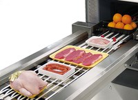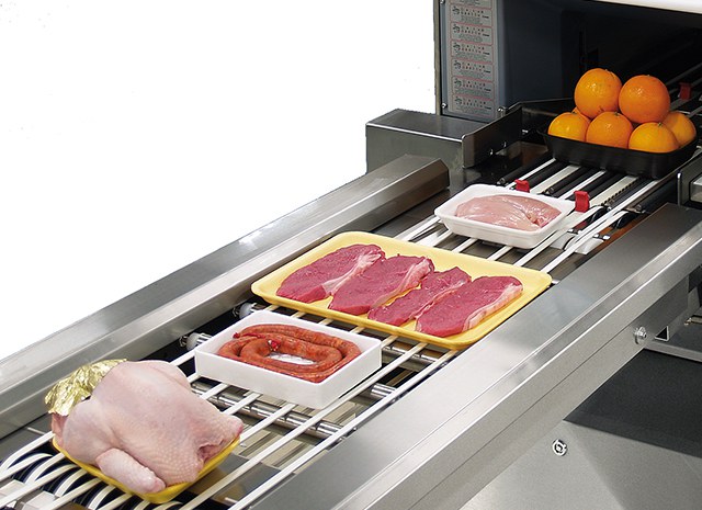 Hochleistungsverpackungsmaschine, speziell entwickelt zum Verpacken von Schalen in Supermärkten und Verpackungszentren (Fleisch, Geflügel, Fisch, Obst und Gemüse).