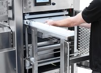 Bis zu 12 Takte/min bei Cut&Seal und bis zu 11 Takte/min bei MAP. Hygienisches Design und sehr kompakte automatische Traysealing-Maschine für alle Arten von vorgeformten regulären Trays. Kann Modified Atmosphere (MAP) und Vakuumverpackungen herstellen. Tray-Transportsystem mit Rollen. Mittlere Produktionsleistung.