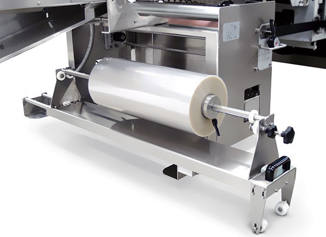 - Leicht zugänglicher Rollenhalter, der das Laden von schweren Rollen vereinfacht. Ausgestattet mit einem motorisierten Folienabwickler für einen optimalen Maschinenbetrieb.