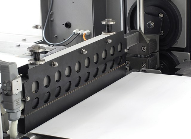 - Die Quersiegelung wird durch ein Long-Dwell-Siegelkopfsystem mit 400 mm breiten Siegelbacken erzeugt. Das System wird von einem bürstenlosen Servomotor angetrieben.