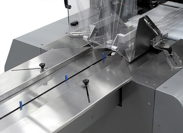 Automatische Verpackungsmaschine zum Verpacken einer großen Anzahl an Produkten in Schrumpf- oder Folienpackungen in Schlauchbeutelformat mit überlappender Längssiegelnaht.