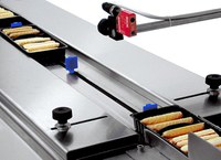 - Die Beutellänge wird entsprechend der Längenmessung des Produkts durch eine Lichtschranke im Einlaufband geregelt.