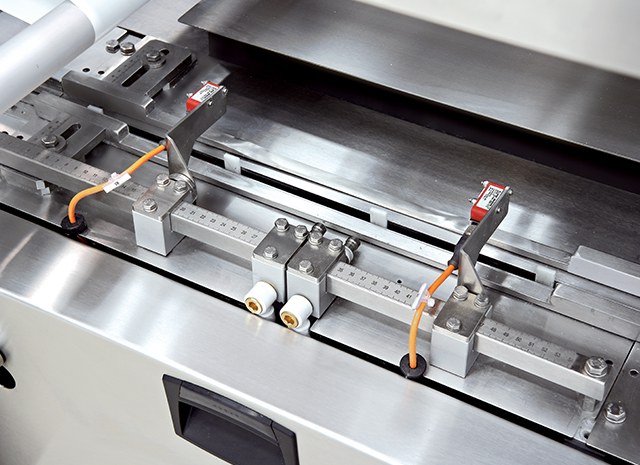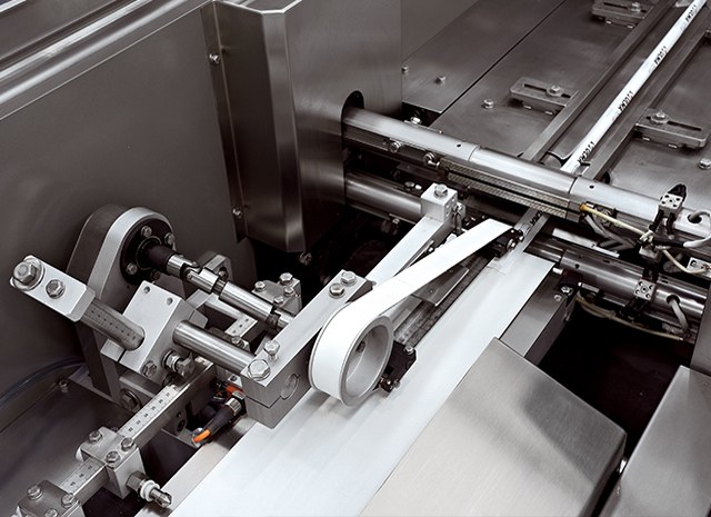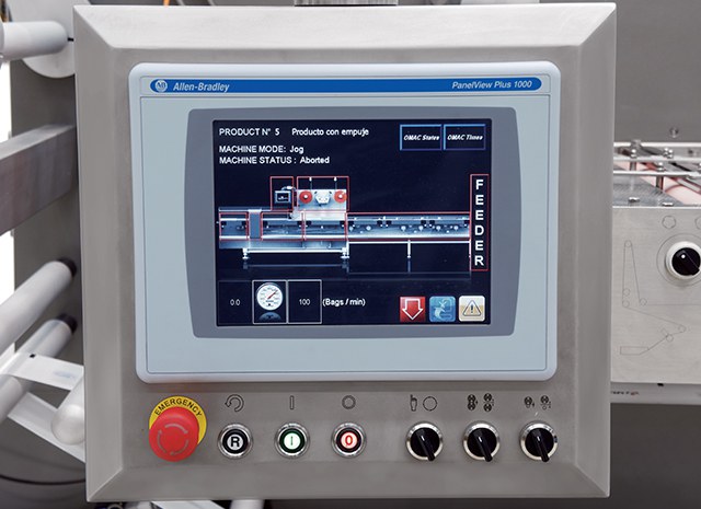 - Elektronische Maschine mit vier unabhängigen Servomotoren (Drehbacken, Siegelwalzen, Einlaufband und motorisierter Rollenhalter), die durch eine elektronische Mehrachsensteuerung synchronisiert werden).