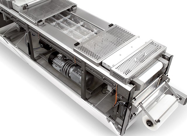 Hygienetiefziehanlage für Weich- oder Hartfolie zur Verpackung unter modifizierter Schutzatmosphäre (MAP) und Vakuumoption. Die anpassungsfähigste Lösung zum Umstieg von manuellen auf automatische Verpackungssysteme.