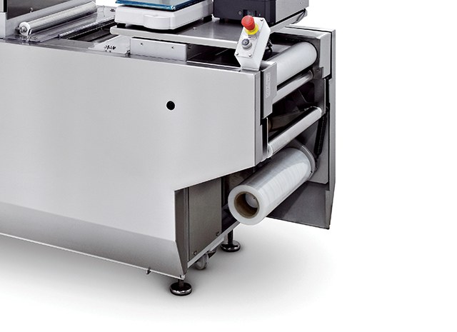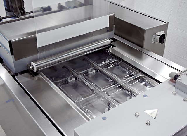 Hygienetiefziehanlage für die Verpackung mit Weichfolie. Optional kann in der Packung ein Vakuum erzeugt oder ein Atmosphärenaustausch (MAP) durchgeführt werden. Eine Tiefziehanlage auf kleinem Raum.