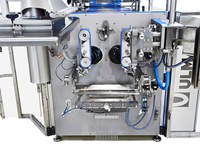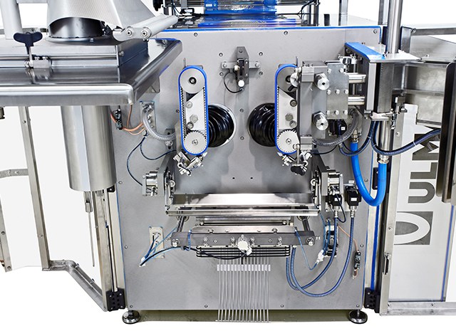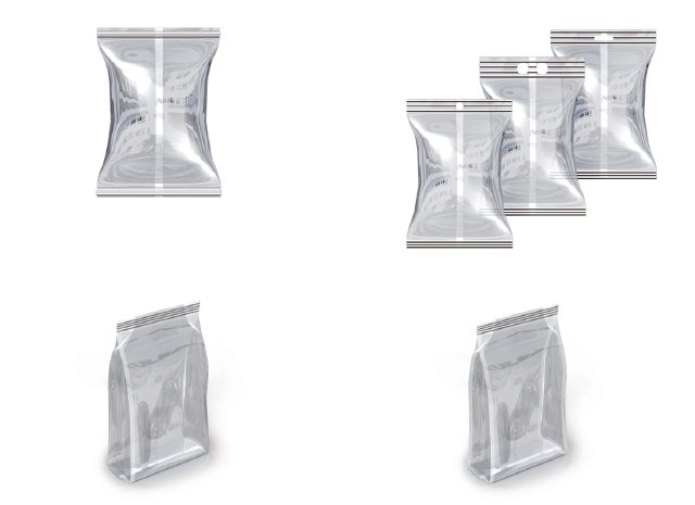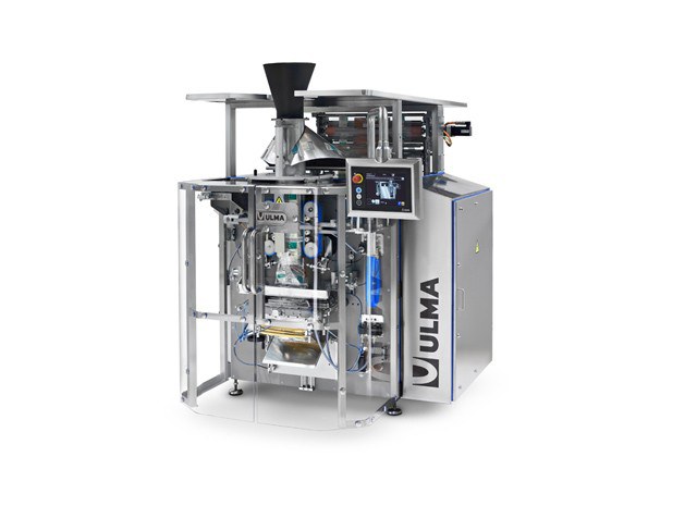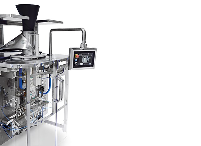 Vertikale Verpackungsmaschine (VFFS) welche Verpackungen mit drei Siegelnähten herstellt. Vertikale, intermittierende Hochleistungsmaschine für mittlere bis hohe Produktionskapazitäten.