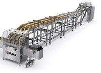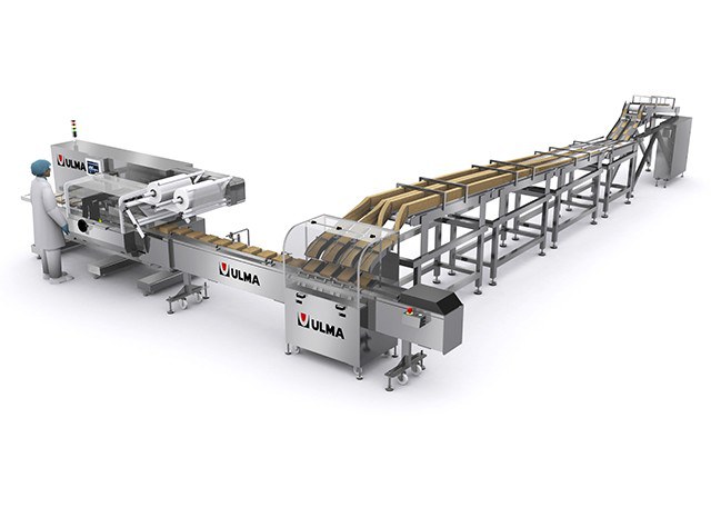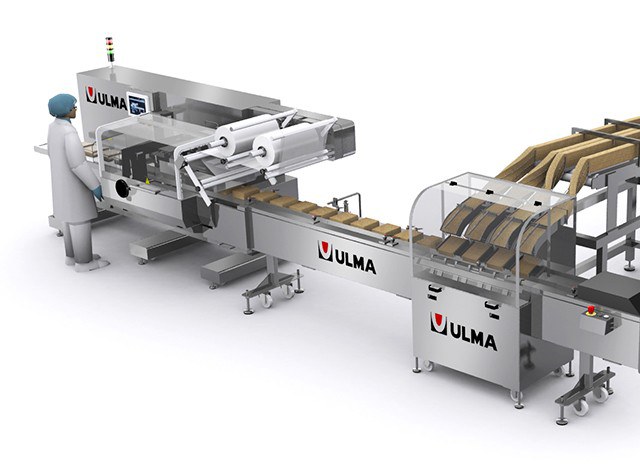 Automatisches Zuführsystem von vier Reihen knusprigem Brote, hochkant in eine Schlauchbeutelmaschine.