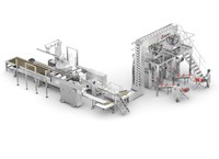 Verpackungslinie für Bäckereiprodukte mit automatischer Beladung für Einzelverpackungen und vertikalen Mehrstückpackungen.