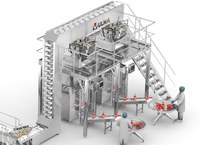 Mit Hilfe von Förderbändern und einem Becherwerk werden die Einzelpackungen zu den Kombinations-Mehrkopfwaagen transportiert, die die festgelegten Mehrpackdosierungen vornehmen.