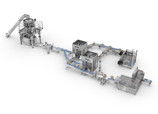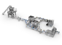 Verpackungslinie für Bonbons und Süßwaren mit automatischer Absackung und Verpackung von Kartons.