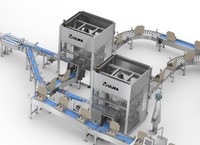 Die Kartonverpackungszellen verfügen über einen Deltaroboter und ein Beutelgruppierungssystem. Der Roboter verwendet ein Vakuumsystem, um die Gruppen einzuteilen und sie den entsprechenden Kartons zuzuführen. Die Kartonverpackungszellen sind flexibel, da sie es ermöglichen, mit den verschiedenen Kundenreferenzen zu arbeiten und verschiedene Gehäusefliesen herzustellen.