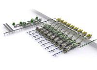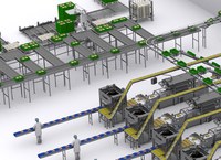 Sowohl die Verteilung als auch der Transport von Schalen und Kunststoffkisten sind voll automatisiert. Die Anlage verfügt über Schalenlager, die zu den Verpackungslinien befördert werden. Auch die Kunststoffkisten werden an jede Linie verteilt.