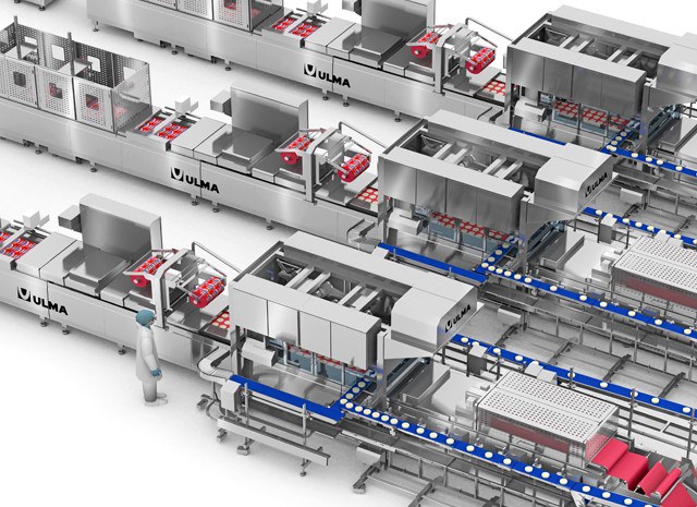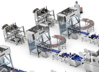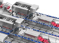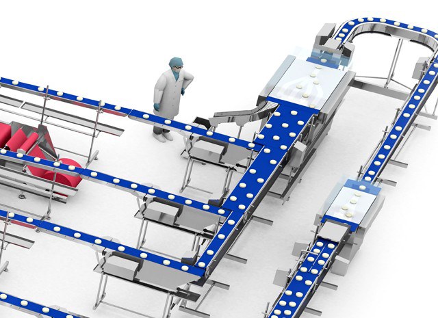 Mittels eines speziell für Frischprodukte angepassten Fördersystems, das die Reinigungsaufgaben erleichtert, wird der Produktstrom in zwei Bereiche aufgeteilt, die das Produkt gleichmäßig in Richtung der Thermoformer verteilen.