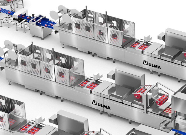 Die drei Tiefziehmaschinen, mit denen die komplette Anlage ausgestattet ist, versehen die untere Kavität der Verpackung mit Hartfolie und versiegeln anschließend den Deckel mit der Oberfolie.