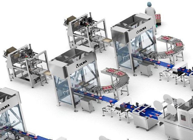 Jede der drei Linien hat einen Kartonaufrichter, der die Kartons mit den gestapelten Kartonbögen formt. Die robotergesteuerte Kartonverpackungszelle ist für das Einbringen der tiefgezogenen Verpackungen in die Kartons verantwortlich und ordnet sie entsprechend dem erforderlichen Mosaik für die Verpackungen an.