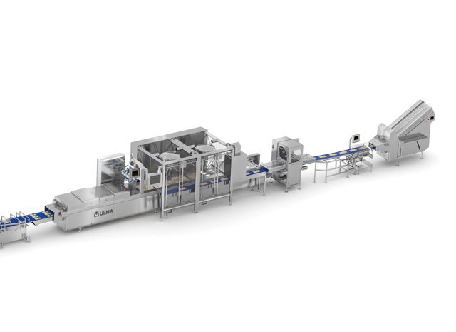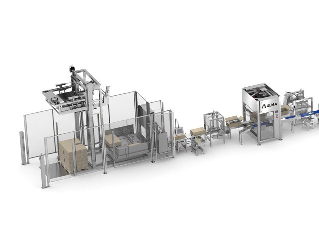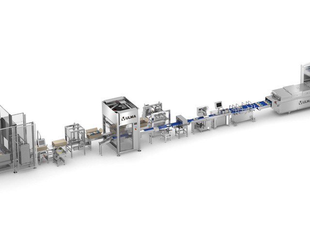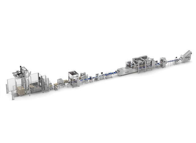 Die Linie beginnt mit einer automatischen Schneidemaschine, die mit einer Produktansammlungsstelle ausgestattet ist um die Roboterladezelle zu beladen. Diese besteht aus zwei Robotern, die die Tiefziehverpackungsmaschine beschicken.