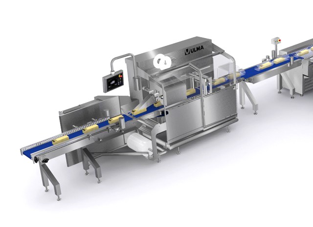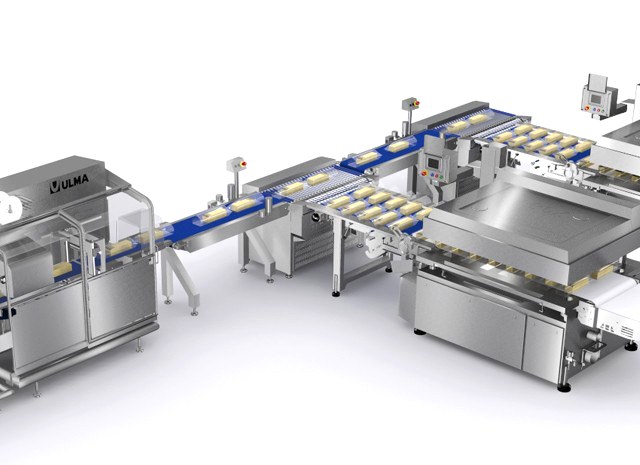 Das von ULMA Packaging patentierte, doppelt automatische Transfersystem ermöglicht es, von der Verpackungsmaschine Beutel zu erhalten, die abwechselnd vorne und hinten offen sind, so dass es möglich ist, die Beladung eines Vakuumkammerbandes mit zwei Siegelschienen zu automatisieren, indem ein 90º-Transfersystem verwendet wird.