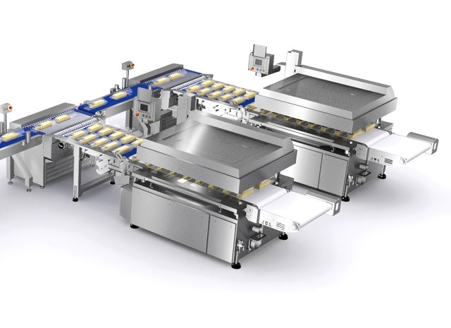 Bei einem 90°-Transfersystem werden die Packungen auf dem Transportband der Vakuumkammer gepaart, so dass beide Siegelschienen genutzt werden können. Wenn die Produkte nicht klein genug sind, um gepaart zu werden, lädt ein automatisches Erkennungssystem das Produkt als Einzelstück.