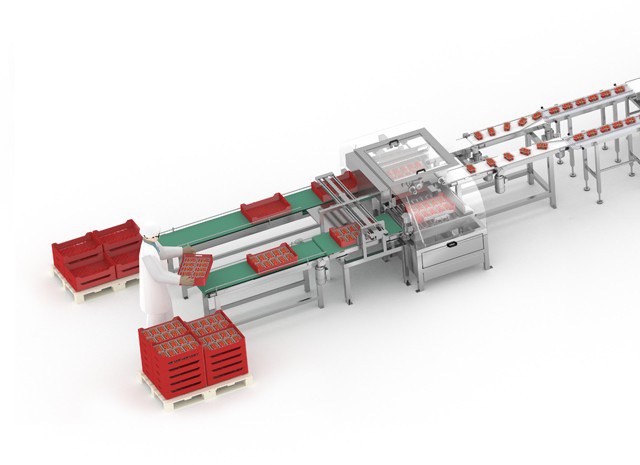 Das Entpacksystem nimmt die Schalenkisten über zwei Zuführbänder auf und legt die Schalen in zwei Förderbänder in der Verpackungslinie ein.