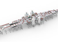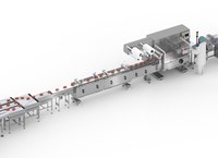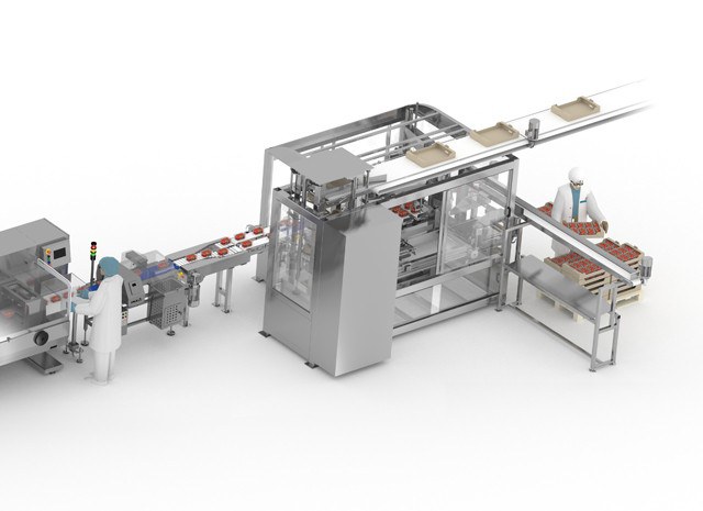 Das Kartonverpackungssystem nimmt die vorgeformten Kartonschachteln auf und ist für die automatische Umhüllung von Schalen im Schlauchbeutel zuständig.