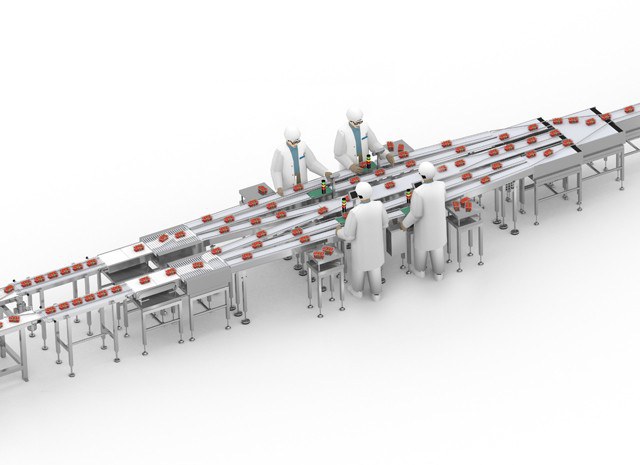 Eine Gruppe von Bedienern ist dafür verantwortlich, den Inhalt jeder Schale zu reduzieren und/oder zu erhöhen, sodass alle Schalen, die den Wiegekontrollbereich verlassen, mit dem Gewicht auf den festgelegten Bereich eingestellt sind.
