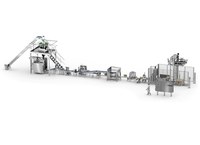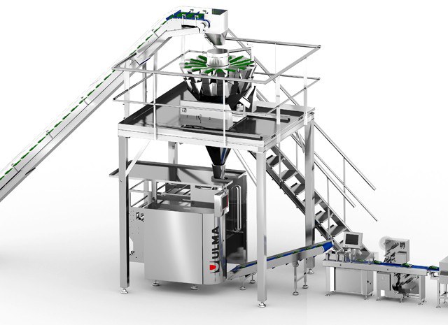 Die Linie beginnt mit einem Produktaufzug, der die Kombinations-Mehrkopfwaage beschickt, die die erforderlichen Dosierungen vornimmt, so dass die vertikale Schlauchbeutelmaschine das Verpacken des Tiefkühlprodukts vornimmt.