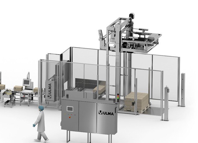 Schließlich werden mit Hilfe eines mechanischen Palettiersystems die Paletten mit den Kartons, die die Verpackungen enthalten, über den Paletten gebildet.